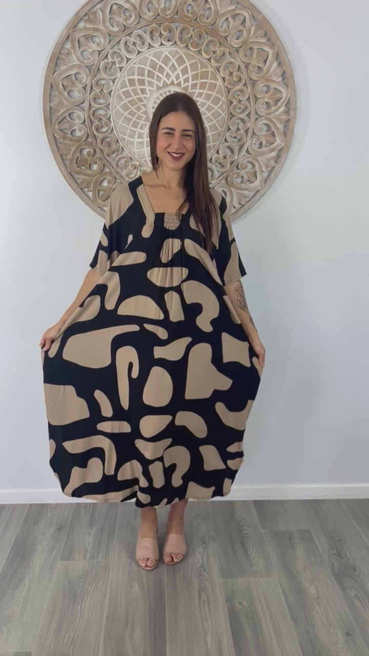 Introducing the Bermuda Kaftan. This is a long, plus size kaftan featuring front shirring, side pockets and splits.