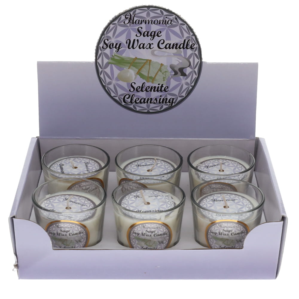 This votive candle is made of soy wax poured in a votive glass and has a burn time of 14 hours. It has a sage scent with a sprinkle of selenite crystal sand to assist with the intention of cleansing.