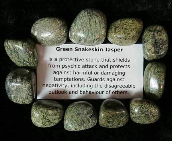 We will intuitively choose one Green Snakeskin Jasper Tumble Stone and cleanse it in our Crystal Quartz Singing Bowl all ready to be sent to you for use.