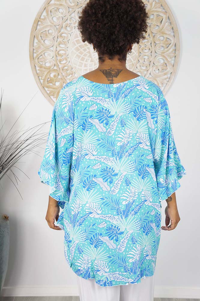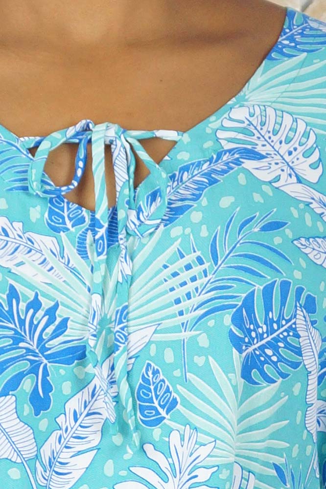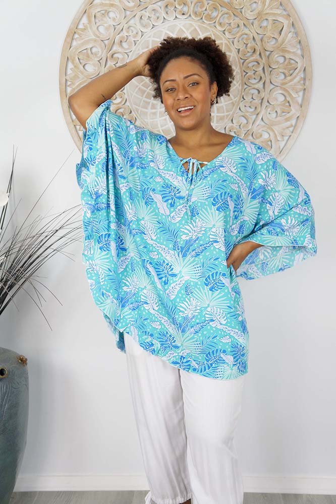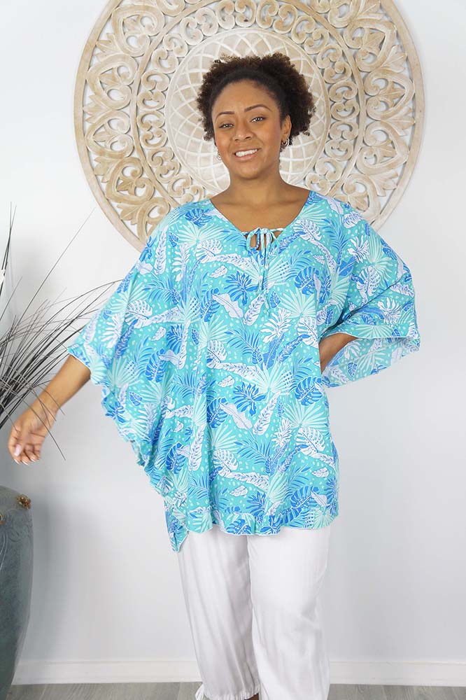 Wear it as a top, a dress, or a tunic over bathers, this product is a complete outfit. A cute tie on the neck line compliments the free flowing figure, while batwing style sleeves give your arms space to move freely.