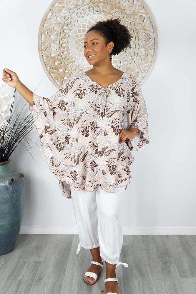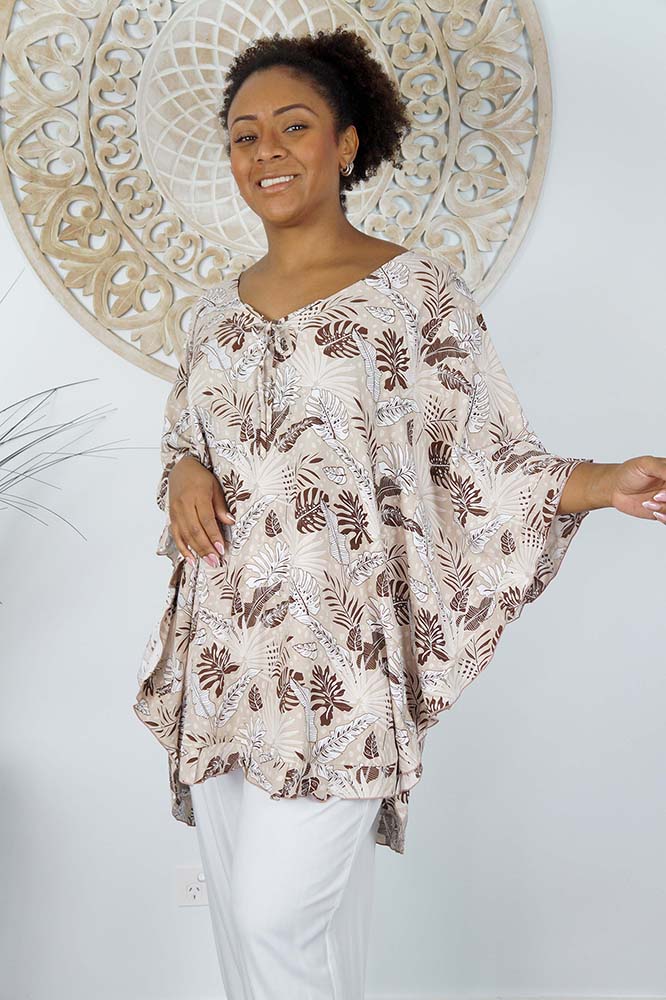 Wear it as a top, a dress, or a tunic over bathers, this product is a complete outfit. A cute tie on the neck line compliments the free flowing figure, while batwing style sleeves give your arms space to move freely.