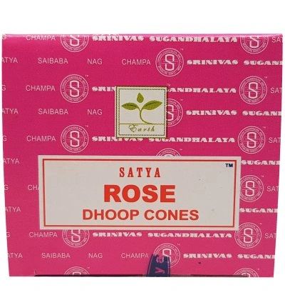 Product Description Satya Rose Incense Cones are made with the highest quality raw materials and are both loved and famous the world over. 1 box of 10 Incense Cones and 1 burner.